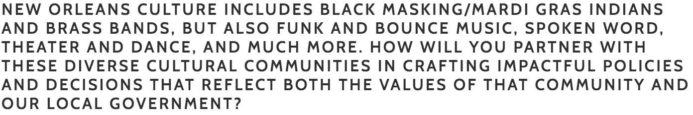Williams: While I believe that we need to continue to actively recruit NOPD officers and have them patrolling on the streets to better connect with community members and address constituent concerns, I do not support increased video surveillance of our neighborhoods. I believe that money could be better spent elsewhere and that under this current Presidential administration it will put vulnerable communities even further at risk to increase surveillance of them under the guise of security.